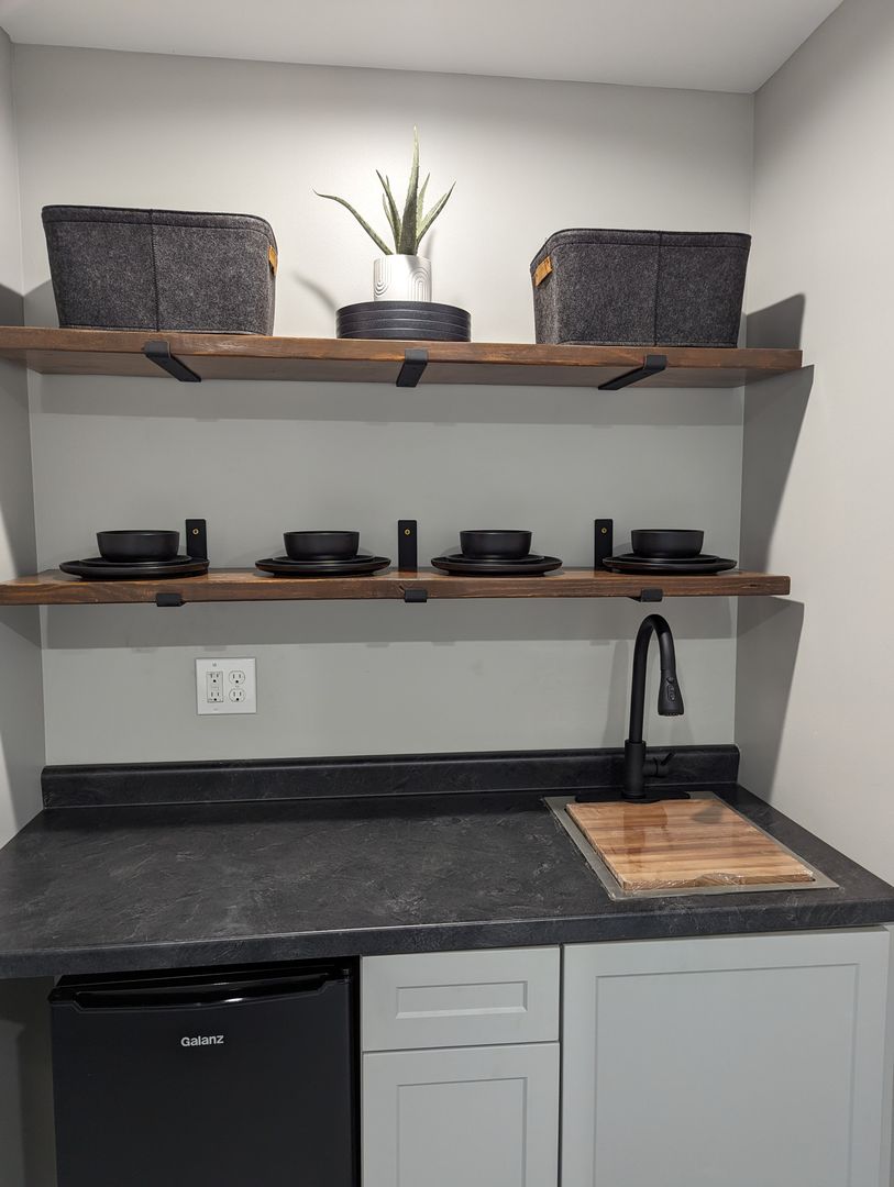*Kitchenette with mini-fridge or refrigerator, microwave, and sink